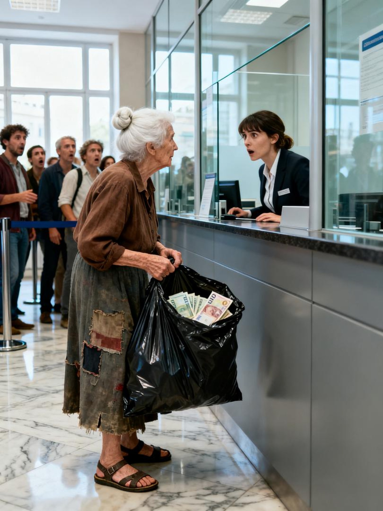 La vieille femme avança lentement, comme si chaque pas lui pesait. Ses mains tiemblaient légèrement. Elle s'arrêta devant la file des guichets, observant les panneaux lumineux sans bien comprendre lequel choisir. Finalmente, elle s'approcha du guichet numéro trois.